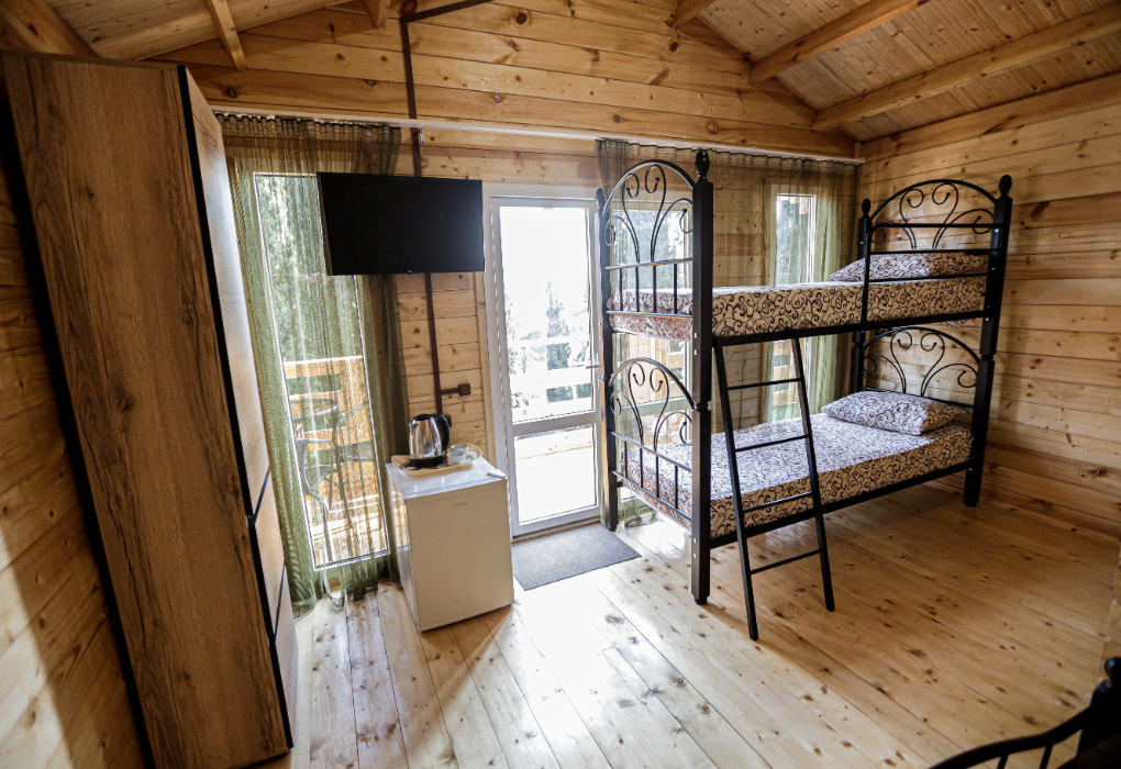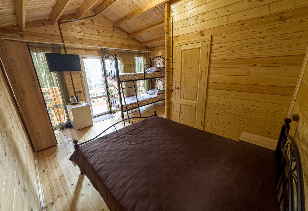 Площадь номера - 15 кв.м. 1 комната. 4 осн. места. 2-ярусная кровать для двоих детей до 12 лет. В номере: телевизор; холодильник; кондиционер; душ; умывальник; туалет; 2-спальная кровать; чайник.